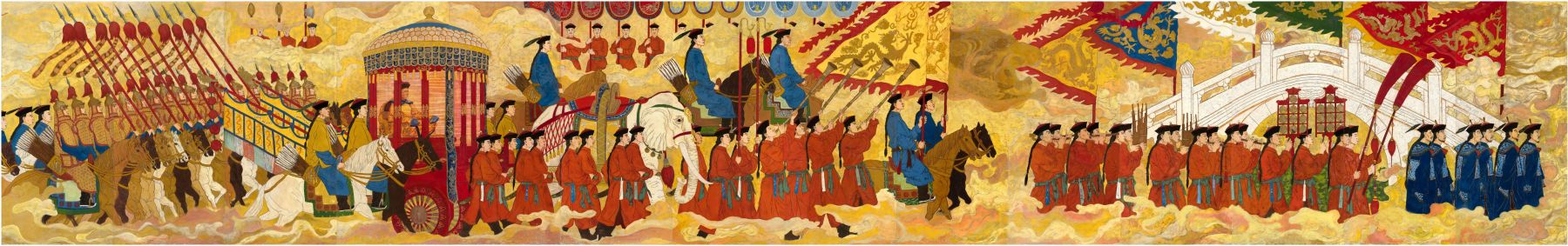 中国古代是一个靠天吃饭的农业型社会,每年皇帝以天子的身份率领群臣百官,若干次在不同时节首日,分赴天、地、日、月、先农各坛举行盛大的礼仪活动,拜求上苍及神仙,保佑天下太平、五谷丰登、国家昌盛。实则,祭祀礼仪更是朝廷向普天之下的百姓万邦展现出国家的政治和经济的意志。壁画中“天子赴祭”的目的地为天坛,祭拜队伍出紫禁城,出正阳门,顺御道(前门大街)再入天坛,于此前必经跨龙须沟上一砖石桥梁,此桥因“天子”而过,故称之为“天子之桥”,简约俗称“天桥”。画面中先头仪仗已行进于“天桥”之上,“天子”乘坐在帐帘遮蔽的象辇之