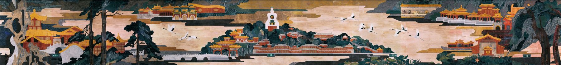 北海揽胜是中国当代壁画中第一幅利用水刀切割的石材镶嵌壁画,作者选用来自30多个国家的80多种天然石材,利用水刀数控技术切割石材,用亿万年自然生成的石材纹理和色泽,描绘出美轮美奂的皇家园林的高贵与清雅。