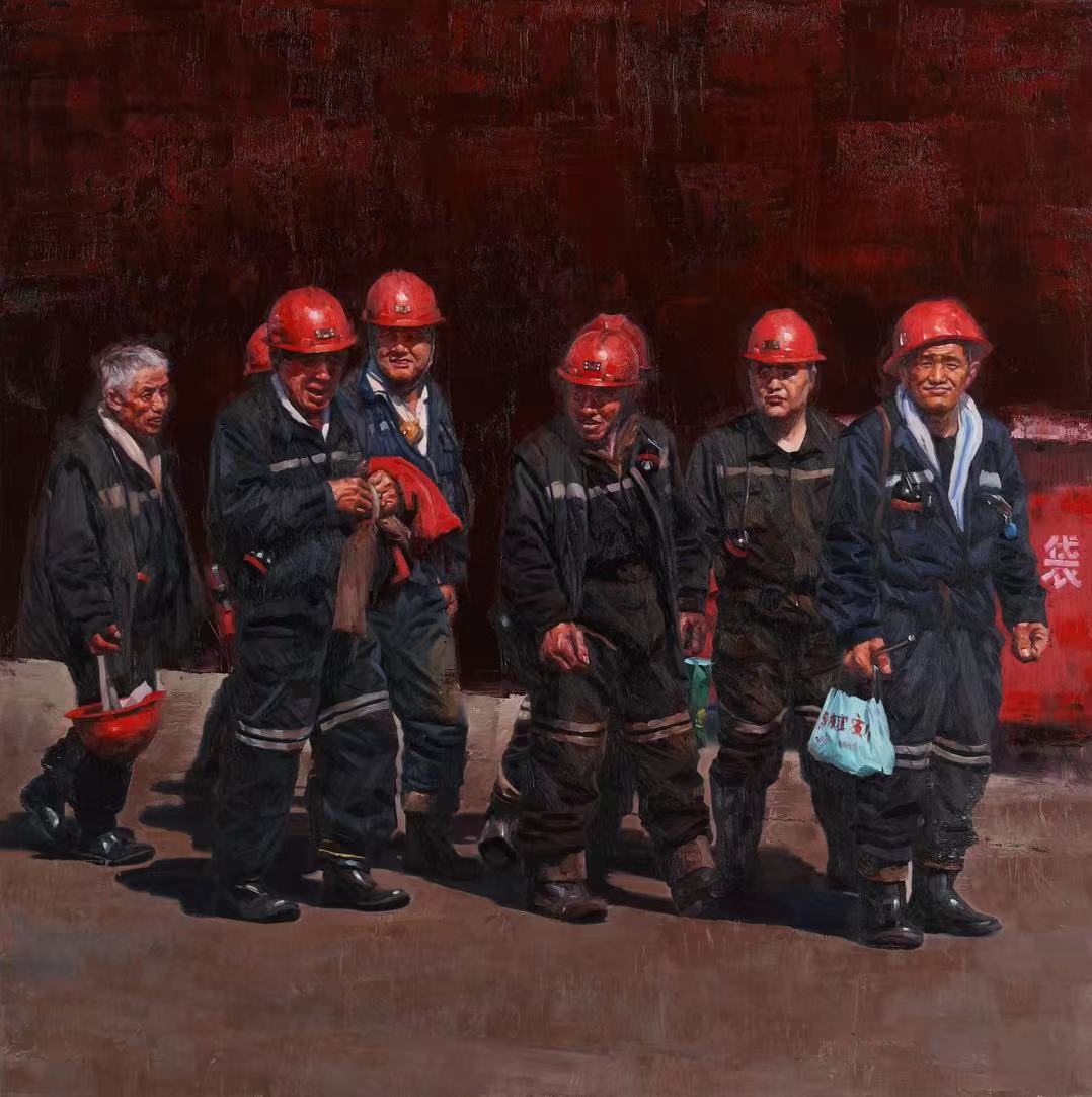 描绘了刚刚从矿井上来,劳作一天的一线矿工的群像。